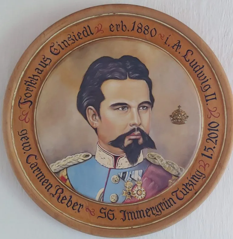 Eine Schützenscheibe im Aufenthaltsraum des Jugendhaus Walchensee zeigt ein Porträt des bayerischen Märchenkönigs Ludwigs II. In seinem Auftrag wurde das ehemals königlich bayerische Forsthaus Einsiedl im Jahre 1880 errichtet.